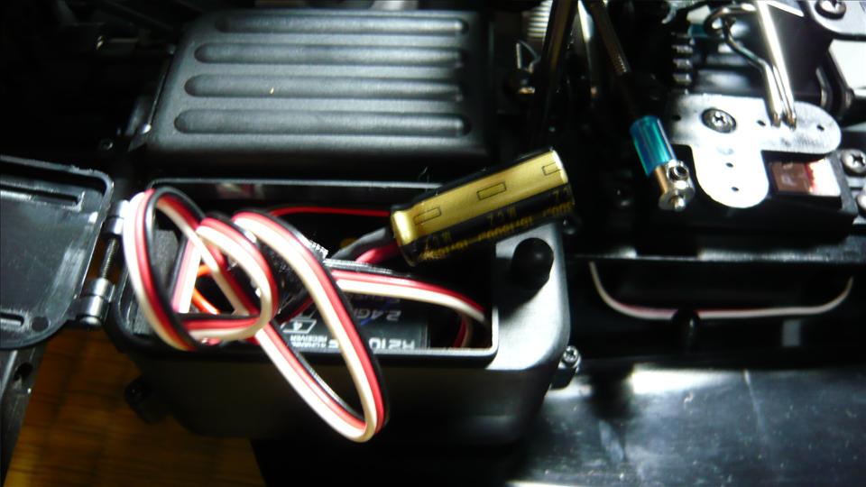 電動カーによくあるトラブルらしいのですが、フタバの2.4GHz受信機は、スロットルを全開時に一時的な電圧不足でノーコンになると事があるとの事を聞いたので、私のインファーノはエンジンカーなのですが、念のためにフタバのコンデンサーを装着しました。