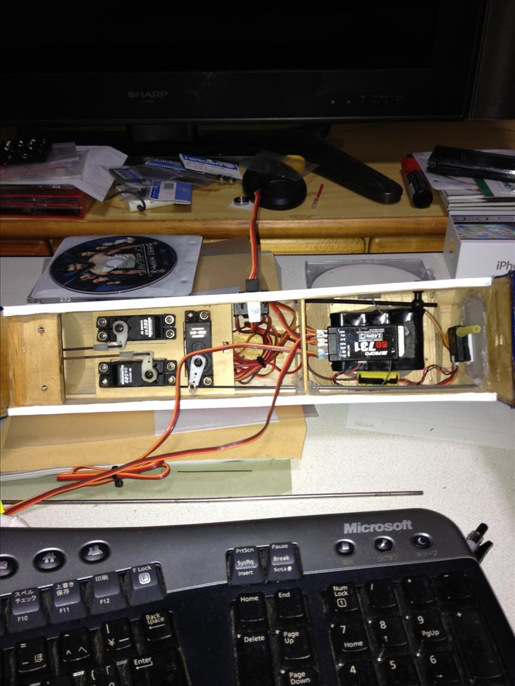 完成機をネットで購入し、受信機(RD-731)を搭載して、プロポセッティング等をして、台風の影響で天候も悪かったので、1フライトだけテストしましたが、おもいっきり左へ持って行かれました・・・・(汗)